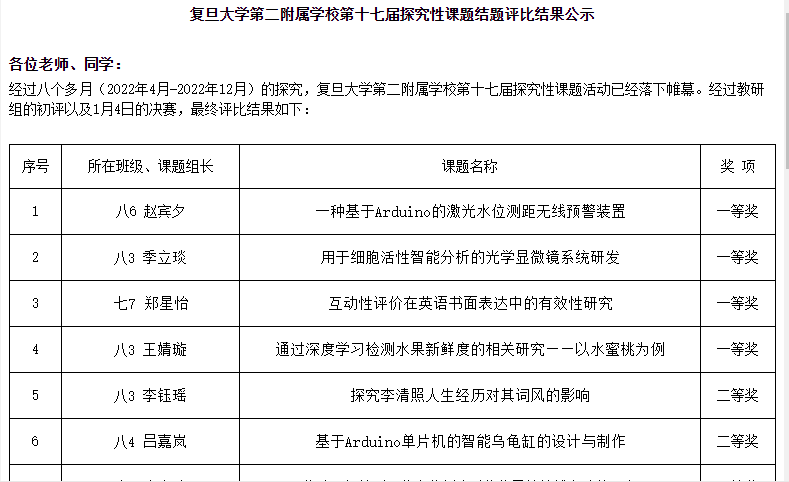 • 复旦大学第二附属学校(初中部)第17届探究性课题结题评比决赛名单公示